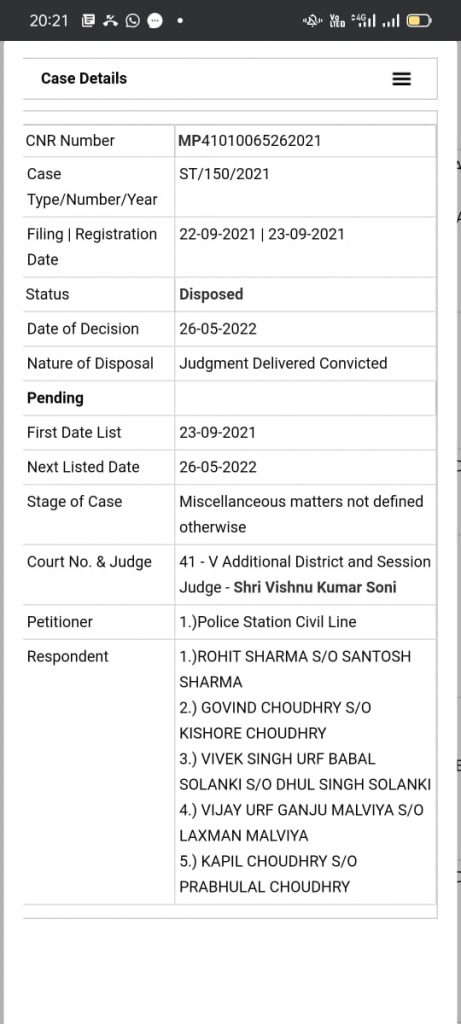 -: प्रेस नोट ::थाना सिविल लाईन देवास के सनसनीखेज एवं चिन्हित हत्याकाण्ड में माननीय न्यायालय द्वारा सभी आरोपियों को आजीवन कारावास एवं 50-50 रूपये अर्थदण्ड से दण्डित किया गयादिनांक 01.06.2021 को थाना सिविल लाईन क्षेत्रांतर्गत करोली नगर में प्रार्थिया ज्योति दुबे के घर के सामने समीर राय पिता रंजन राय उम्र 38 साल निवासी सुतार बाखल देवास हाल करोली नगर देवास को एक्टिवा स्कूटी पर सवार होकर चार अज्ञात व्यक्तियों द्वारा देशी पिस्टल (गन) से सीने में गोली मार कर हत्या की गई थी। अज्ञात आरोपियों द्वारा किये गये इस अंधे हत्याकाण्ड से क्षेत्र में दहशत का माहोल निर्मित होकर सनसनी फैल गई थी। जिस पर थाना सिविल लाईन में अपराध क्रमांक 282/2021 धारा 302,34, 120बी भादवि व 25,27 आर्म्स एक्ट का अपराध पंजीबद्ध कर उक्त प्रकरण में श्रीमान पुलिस अधीक्षक महोदय श्री शिवदयाल सिंह, श्रीमान अतिरिक्त पुलिस अधीक्षक (शहर) महोदय श्री मनजीत सिंह चावला श्रीमान नगर पुलिस अधीक्षक महोदय श्री विवेक सिंह चौहान एवं श्रीमान उप पुलिस अधीक्षक महोदय (मुख्यालय) श्री किरण कुमार शर्मा के निर्देशन में थाना प्रभारी याना सिविल लाईन संजय सिंह द्वारा विवेचना की गई थी। प्रकरण को सनसनीखेज एवं चिन्हित श्रेणी में रखा गया था। उक्त प्रकरण में थाना प्रभारी थाना सिविल लाईन निरीक्षक संजय सिंह द्वारा टीम गठित कर प्रकरण के आरोपीगण 1. रोहित शर्मा उर्फ बच्चा पिता संतोष शर्मा जाति सुतार उम्र 21 साल निवासी ग्राम मिसरोद याना डोलरिया ● जिला होशंगाबाद हाल किराये से पानी की टंकी के पीछे बद्रीधाम नगर देवास 2. गोविंद चौधरी पिता किशोर चौधरी जाति गारी उम्र 20 साल निवासी 84/4 शान्तिपुर देवास, 3. विवेक सिंह उर्फ बबल सोलंकी पिता धुल सिंह सॉलकी जाति राजपुत उम्र 28 साल निवासी ग्राम बजेपुर थाना | विजयांगज मन्डी हाल किराये से हकीम हुसेन का मकान नं. 38 राम नगर एक्सटेंशन देवास, 4. विजय मालवीय उर्फ गंजु पिता लक्षमण मालवीय जाति बलाई उम्र 20 साल निवासी रूपापुरा याना काली सिंघ जिला शाजापुर हालकबीट नगर थाना कोतवाली देवास एवं 5 कपिल चौधरी पिता प्रभुलाल चौधरी उम्र 25 साल निवासी 11/3, शांतिपुरा थाना कोतवाली देवास को गिरफ्तार कर उक्त प्रकरण में विवेचना पूर्ण कर चालान माननीय न्यायालय में पेश किया गया था। जिसमे आज दिनांक 26.05.2022 को माननीय न्यायालय श्री विष्णुकुमार सोनी, न्यायालय देवास द्वारा उक्त सभी आरोपीगणो को आजीवन कारावास एवं 50-50 हजार रूपये अर्थदण्ड से दण्डित किया गया हैं।उक्त अंधे हत्याकाण्ड के खुलाशे में थाना प्रभारी थाना सिविल लाईन निरीक्षक श्री संजय सिंह, उनि गौरव नगावत, उनि उपेन्द्र नाहर, उनि गणेशलाल जटिया, सउनि प्रकाश चन्द्र राजोरिया, सउनि राकेश बाबु शर्मा, सउनि (कार्य) ठाकुर लाल, प्र. आर. 804 ध