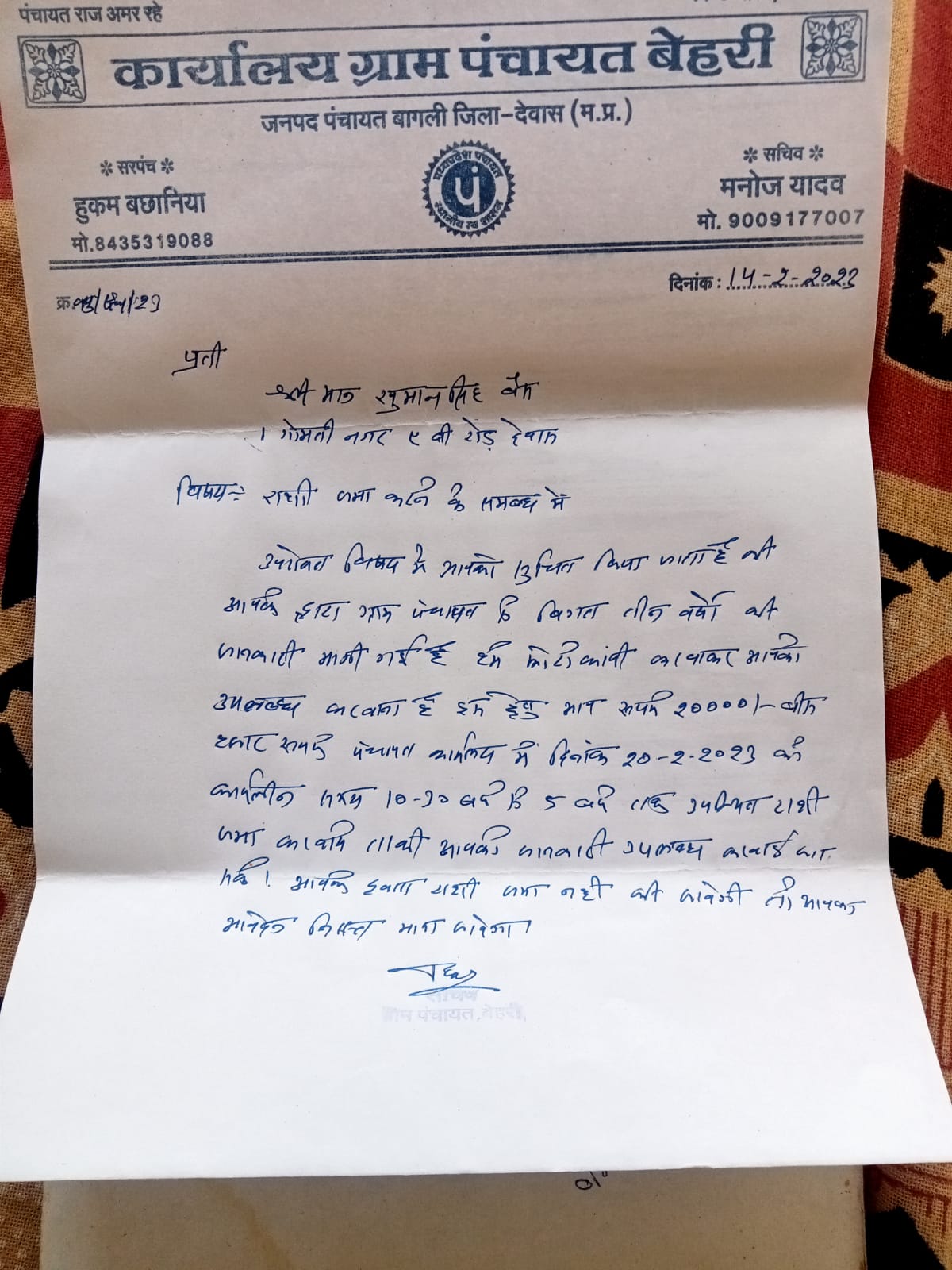 देवास – देवास जिला अंतर्गत बागली जनपद की ग्राम पंचायत बेहरी में कोई भी शासकीय कार्य या जानकारी के लिए रोजगार सहायक मनोज यादव सचिव पद से हटने के बाद भी सचिव पद उपयोग वाला लेटर पैड उपयोग कर रहे हैं। जबकि उक्त ग्राम पंचायत में सचिव पद पर रायसिंह सेंधव नियुक्त है। उनसे किसी भी संबंध में जानकारी लेने पर उनकी जगह मनोज यादव सचिव बनकर व्यवहार कर रहे हैं। और बकायदा लेटर पैड का गलत उपयोग करते हुए अभी भी सचिव पद की रोब झाड़ते हैं, जो नियम के विरुद्ध है इस संबंध में बागली जनपद सीईओ प्रभांशु सीहं इस मामले से अवगत होते हुए भी कोई ध्यान नहीं दे रहे अधिकतर शासकीय कार्यों में मनोज यादव सचिव पद का लेटर पैड उपयोग किया जा रहा है। हाल ही में देवास के आरटीआई कार्यकर्ता द्वारा पंचायत संबंधी जानकारी सचिव रायसिंह सेंधव से मांगी गई उस आरटीआई कार्यकर्ता को टालने के लिए रोजगार सहायक मनोज यादव ने अपने लेटर पैड का उपयोग कर फोटोकॉपी के नाम पर ₹20000 की मांग कर डाली जबकि जानकारी में इतनी फोटोकॉपी राशि नहीं लगती है।