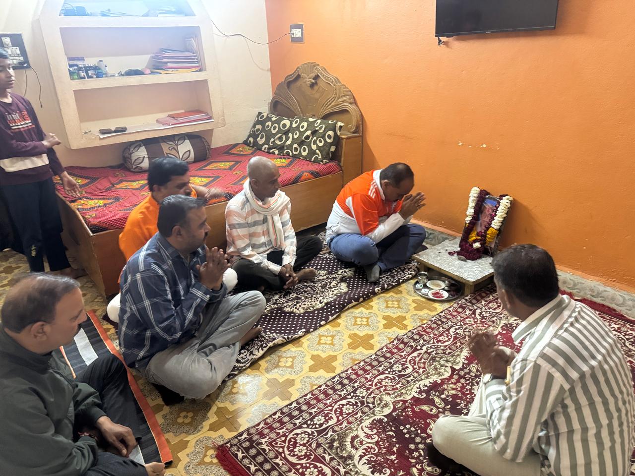 देवास । (निप्र) युवा समाजसेवी लेखक दिनेश सांखला के पिता श्री गोपाल जी सांखला के निधन हो जाने पर श्रद्धा सुमन अर्पित करने हेतु प्रयागराज से लौटने के पश्चात भाजपा जिला अध्यक्ष रायसिंह सेंधव कॉलोनी बाग स्थित दिनेश सांखला के निज निवास पर पहुंचकर मृत आत्मा को श्रद्धांजलि अर्पित की एवं प्रभु से प्रार्थना की श्री गोपाल जी की आत्मा को प्रभु अपने श्री धाम में श्री चरणों में स्थान प्रदान कर तथा सांखला परिवार को दुख सहन करने की शक्ति प्रदान करें l श्रद्धांजलि देने के लिए पार्षद प्रतिनिधि अजबसिंह ठाकुर पूर्व सरपंच महिपालसिंह सेंधव अनूप सिंह सेंधव हरिसिंह सेंधव आदि ने भी सांखला परिवार के प्रति दुख व्यक्त करते हुए श्रद्धांजलि अर्पित की l
