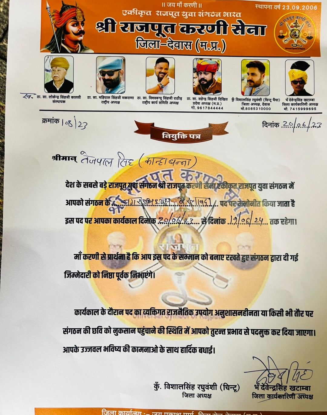 श्री राजपूत करणी सेना में तहसील स्तर पर हुई नियुक्तियां